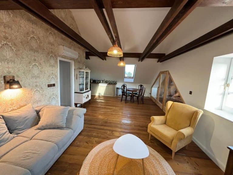 A Mandula lakosztály ideális választás családoknak és baráti társaságoknak. Két hálószobával, nappalival és konyhával rendelkezik, biztosítva a kényelmes és tágas életteret. Az exkluzív enteriőrök elegáns légkört teremtenek, míg a nappali kényelmes bútorai tökéletes helyet kínálnak a pihenésre. A hatalmas panorámás verandáról lenyűgöző kilátás nyílik a környező tájra, ahol a vendégek valóban átélhetik a természet szépségét. A villához fűtött medence is… mutass többet  tartozik, amely a pihenést és a kikapcsolódást szolgálja. Élvezd a komfortot és a klasszikus stílust a Mandula lakosztályban, ahol a pihenés élménye a történelmi bájjal találkozik!